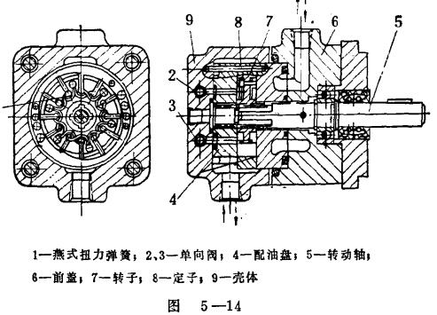 圖5-14為一種雙作葉片馬達(dá)的結(jié)構(gòu)圖。它和雙作用葉片泵相比,有以下幾個(gè)特點(diǎn):