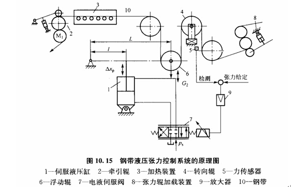 在帶鋼生產(chǎn)過程中,為了保證鋼帶的質(zhì)量,常要求控制帶材的張力,為此,常用伺服系統(tǒng)來實現(xiàn)恒張力控制。圖10.15所示為鋼帶張力控制系統(tǒng)的原理圖,2為牽引轆,8為張力輥加載裝置,它們便鋼帶具有一定的張力。但由于種種原因,張力可能有波動,為此需在轉(zhuǎn)向輯4的軸承上設(shè)置力傳感器5,以檢測帶材的張力,并用伺服液壓缸1帶動浮動轆6來調(diào)節(jié)張力。如果實際張力與給定值相等,則偏差信號為零,伺服壓力機(jī)電液伺服閥沒有輸出伺服。液壓缸保持不動,浮動棍不動。當(dāng)實測張力與要求張力有偏差時,偏差電壓經(jīng)放大器9放大后,使得伺服壓力機(jī)電液伺服閥7有輸出,伺服液壓缸活塞帶動浮動輯6上下移動,調(diào)節(jié)鋼帶的張緊程度以減少其偏差,因此該系統(tǒng)是一個恒值力控制系統(tǒng)。它保證了鋼帶的張力符合要求,提高了鋼材的質(zhì)量。張力控制系統(tǒng)的方塊圖如圖10.16所示。