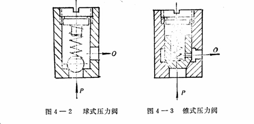 直動式溢流閥的工作原理如圖4-1所示,就溢流閥閥芯結(jié)構(gòu)形式而言,圖4-1是滑閥式直動壓力閥。除此而外常見的還有球閥式和錐閥式,如圖1-2和圖4-3所示,它們統(tǒng)稱為閥座式壓力閥。在油壓小于彈簧力時(shí),球形閥芯和錐形閥芯在彈簧力作用下緊緊壓在閥座上,密封性較好,閥芯和閥套之間沒有如同滑閥式壓力閥具有一定油封長度而產(chǎn)生的動作死區(qū)。只要油壓力超過彈簧力,閥芯立即開啟,靈敏性很高,壓力超調(diào)量小,所以在導(dǎo)控式溢流閥巾,不論導(dǎo)閥和主閥普遍采用錐閥結(jié)構(gòu)。但因直動式球閥和錐閥式壓力閥在大流最時(shí)易發(fā)生振動和噪音,閥芯易和閥座發(fā)生撞擊,壽命短,故一般多作為安全閥使用。