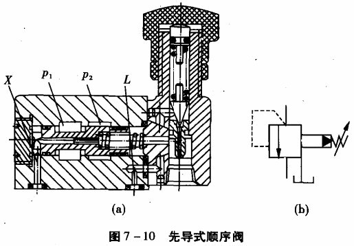 先導(dǎo)式順序閥與直動式順序閥一樣也有內(nèi)控外泄、外控外泄和外控內(nèi)泄的控制方式,圖7-lO(a)所示為先導(dǎo)式順序闊的結(jié)構(gòu)原理圖,圖7 -10Cb)為內(nèi)控外泄式先導(dǎo)順序閥的圖形 符號。