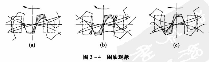 (2)困油現(xiàn)象:四柱油壓機(jī)齒輪泵要平穩(wěn)工作,齒輪嚙合的重疊系數(shù)必須大于1,也就是說要求在一對 輪齒即將脫開嚙合前,后面的一對輪齒就要開始嚙合。就在兩對輪齒同時嚙合的這一小段時間內(nèi),留在齒間的油液困在兩對輪齒和前后泵蓋所形成的一個密閉空間中,如圈3 ~4(a)所示,當(dāng)齒輪繼續(xù)旋轉(zhuǎn)時,這個空間的容積逐漸減小,直到兩個嘀合點(diǎn)A,B處于節(jié)點(diǎn)兩側(cè)的對稱位置時,如圖3 -4(b)所示,其封閉容積減至最小。由于油液的可壓縮性很小,當(dāng)封閉空間的容積減小時,被困的油液受擠壓,壓力急劇上升,油液從零件接合面的縫隙中強(qiáng)行擠出,使齒輪和軸承受到很大的徑向力;當(dāng)齒輪繼續(xù)旋轉(zhuǎn),這個封閉容積又逐漸增大到如圖3 -4(c)所示的最大位置,容積增大時又會造成局部真空,使油液中溶解的氣體分離,產(chǎn)生氣穴現(xiàn)象,這些都將使齒輪泵產(chǎn)生強(qiáng)烈的噪聲,這就是齒輪泵的困油現(xiàn)象。