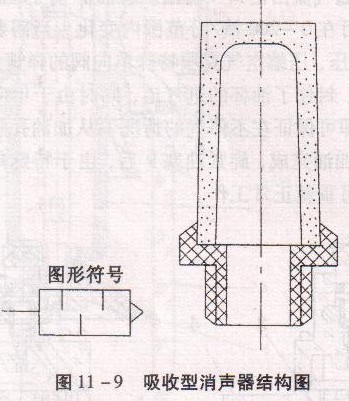 圖11 -9為四柱油壓機(jī)吸收型消聲器結(jié)構(gòu)圖。當(dāng)氣流通過由聚苯乙烯顆;蜚~珠燒結(jié)而成的消聲罩時,氣流與消聲材料的細(xì)孔相摩擦,聲能量被部分吸收轉(zhuǎn)化為熱能,從而降低了噪聲強(qiáng)度。這種消聲器可良好地消除中、高頻噪聲。