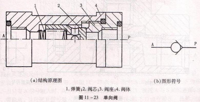 圖11 -23為單向閥的結構圖及其圖形符號。當氣流從P口進人時,氣壓力克服彈簧力和閥芯2與閥體4之間的摩擦力,使閥芯左移,閱口打開,氣流正向通過。為保證氣流穩(wěn)定流動,P腔與A腔應保持一定壓力差,使閥芯保持開啟狀態(tài)。當氣流反向進入A腔時,閥口關閉,氣流反向不通。