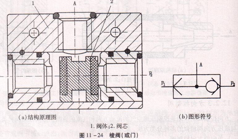 圖11 -24為梭閥結構圖及其圖形符號。當需要兩個輸人口PI和巴均能與輸出口A相通,而又不允許PI和P2相通時,就可以采用梭閥(或門)。當氣流由PI進人時,閱芯右移,使PI與A相通,氣流由A流出。與此同時,閥芯將P2通路關閉。反之, P2與A相通, PI通路關閉。若P1和P2同時進氣,哪端壓力高,A就與哪端相通,另一端自動關閉。