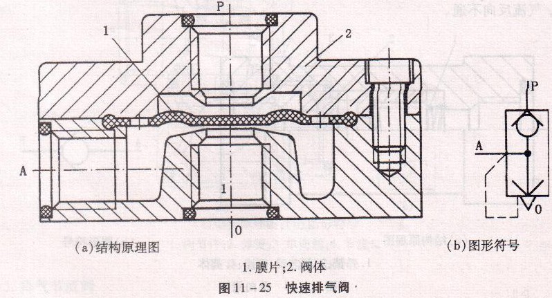 圖11 -25所示為快速排氣閥的結構原理圖及其圖形符號。當壓縮空氣進入進氣口P時,使膜片1向下變形,打開P與A的通路,同時關閉排氣口0。當進氣口P沒有壓縮空氣進入時,在A口與P口壓差的作用下,膜片向上復位,關閉P口,使A口通過O口排氣。